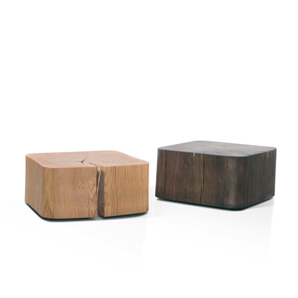 The coffee table CT M is sawn from a log which is at least 180 years old, it is then planed and sanded in the OC workshop. It is a gently rounded side table, stool and object all in one. Quietly gliding soft rubber castors that rotate 360° are worked into the trunk by hand. Each CT M is made from one piece of wood. The core, the heart of the tree, remains in the center of every table. Location and room temperature will affect the piece and cause cracks which is a natural and delightful contrast to the perfectly crafted surface. CT M can be purchased in natural light oak or dark smoked oak with an oiled surface.