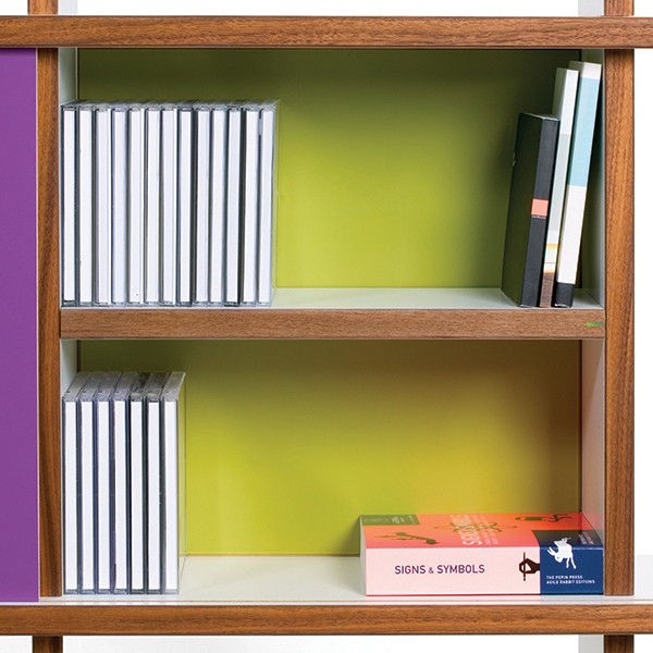 The shelf system can can be made new again and again with the QR-sliding doors – visually and functionally. The square or rectangular doors add accents or transform an open shelf into a closed storage space. The sliding doors can be inserted easily into the provided groove which guide the doors along. All doors are available in three wood types, 16 harmonious colours, pure white, four acrylic glass options and as a mirror or photo door. In the basic version each sliding door has a painted white interior, which can be coloured when desired : With a few easy steps you can switch from one colour to another and create an entirely new environment. Unlimited creative freedom!