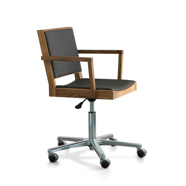 The ETS B desk-chair for office or home office is available in oiled oak or walnut, optional with a core leather pad or upholstered with „Canvas“, a fabric by Kvadrat.