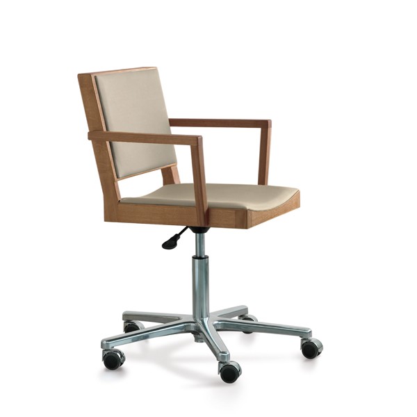 The ETS B desk-chair for office or home office is available in oiled oak or walnut, optional with a core leather pad or upholstered with „Canvas“, a fabric by Kvadrat.