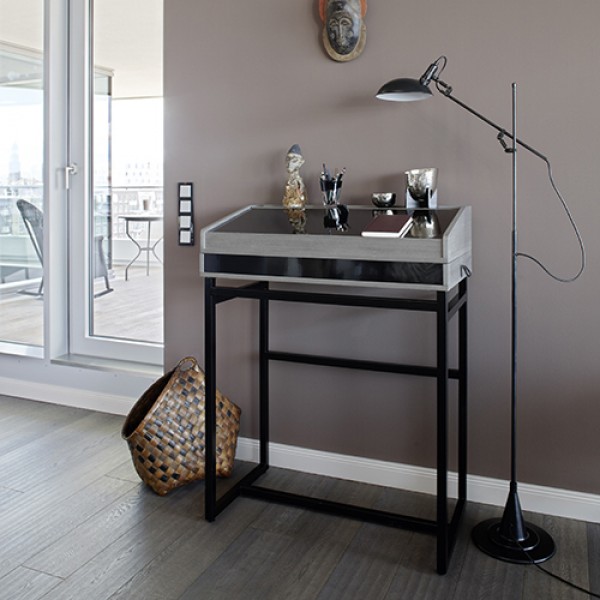 Inspiriert von Möbeln vergangener Zeiten ist Comptoir für die Bedürfnisse der heutigen Zeit entstanden. Die abgeschrägte Schreibfläche in Hochglanzoptik kontrastiert mit der ansonsten seidenmatten Holzoberfläche. Der praktische Auflageboden lässt sich optional nach rechts und links herausziehen. Der Klappmechanismus der Auflageplatte wurde wie der Mechanismus eines alten Musikmöbels gestaltet und ermöglicht das Aufstellen einer ergonomisch angenehmen Schreibfläche.